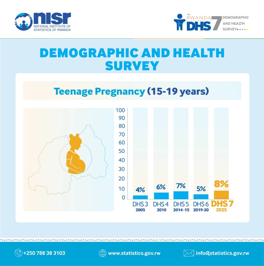 Ubushakashatsi bwa 7 ku buzima n’imibereho, Demographic and Health Servey (DHS 7), bw’Ikigo cy’Igihugu cy’Ibarurishamibare mu Rwanda (NISR) bwagaragaje ko abangavu, bafite hagati y’imyaka 15-19 y’amavuko, baterwa inda bageze ku 8% muri 2025, bavuye kuri 5% muri 2020. Bisobanuye ko nibura umwe mu bangavu 13 yatangiye inshingano zo kurera.