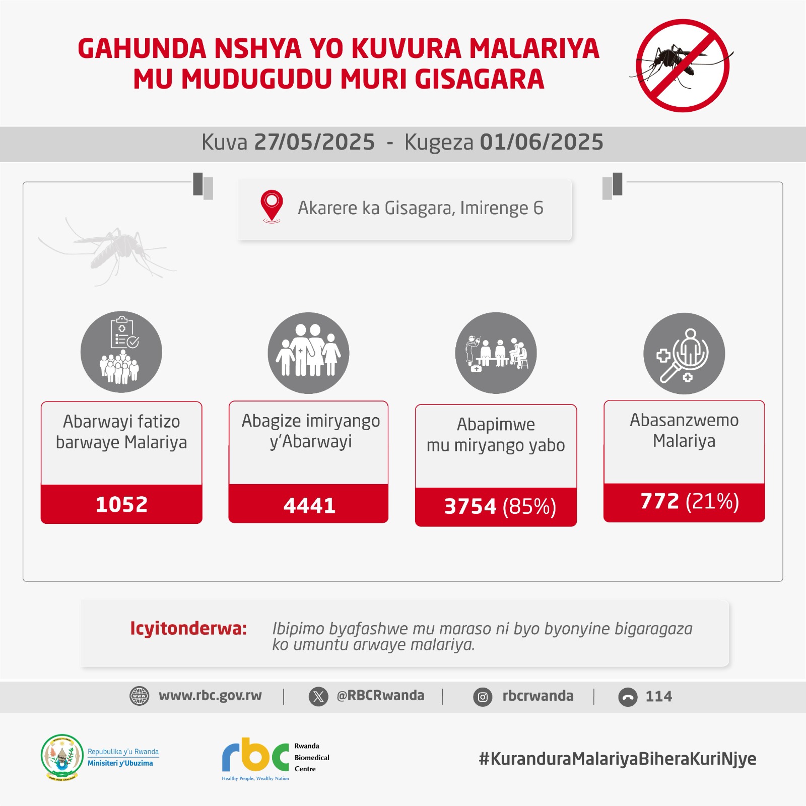 Imibare y’Ikigo cy’Igihugu cy’Ubuzima (RBC) igaragaza ko mu baturage 3,754 bapimwe indwara ya Malaria mu karere ka Gisagara, mu gihe cy’iminsi itandatu, basanze 772 (21%) bafite iyi ndwara.