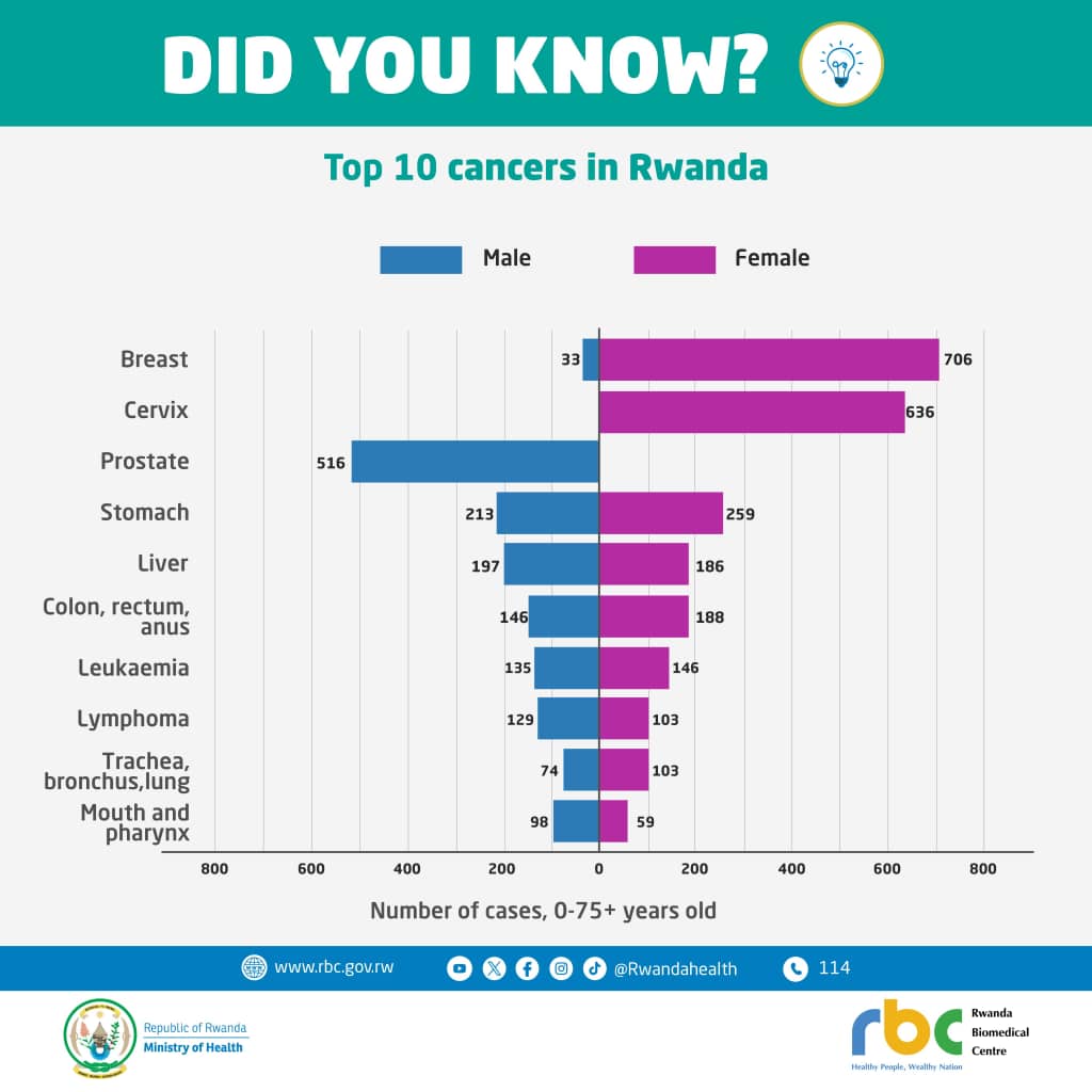 Kanseri y’ibere ni yo yaje ku mwanya wa mbere n’abarwayi 739, ikurikirwa n’iy’inkondo y’umura n’abarwayi 636, mu gihe iya ‘Prostate’ yaje ku mwanya wa gatatu n’abarwayi 516.