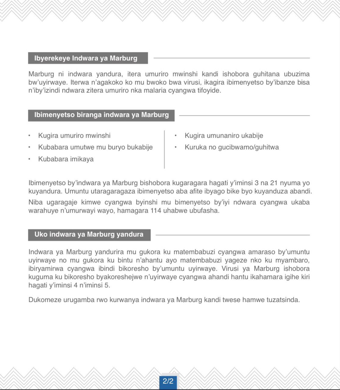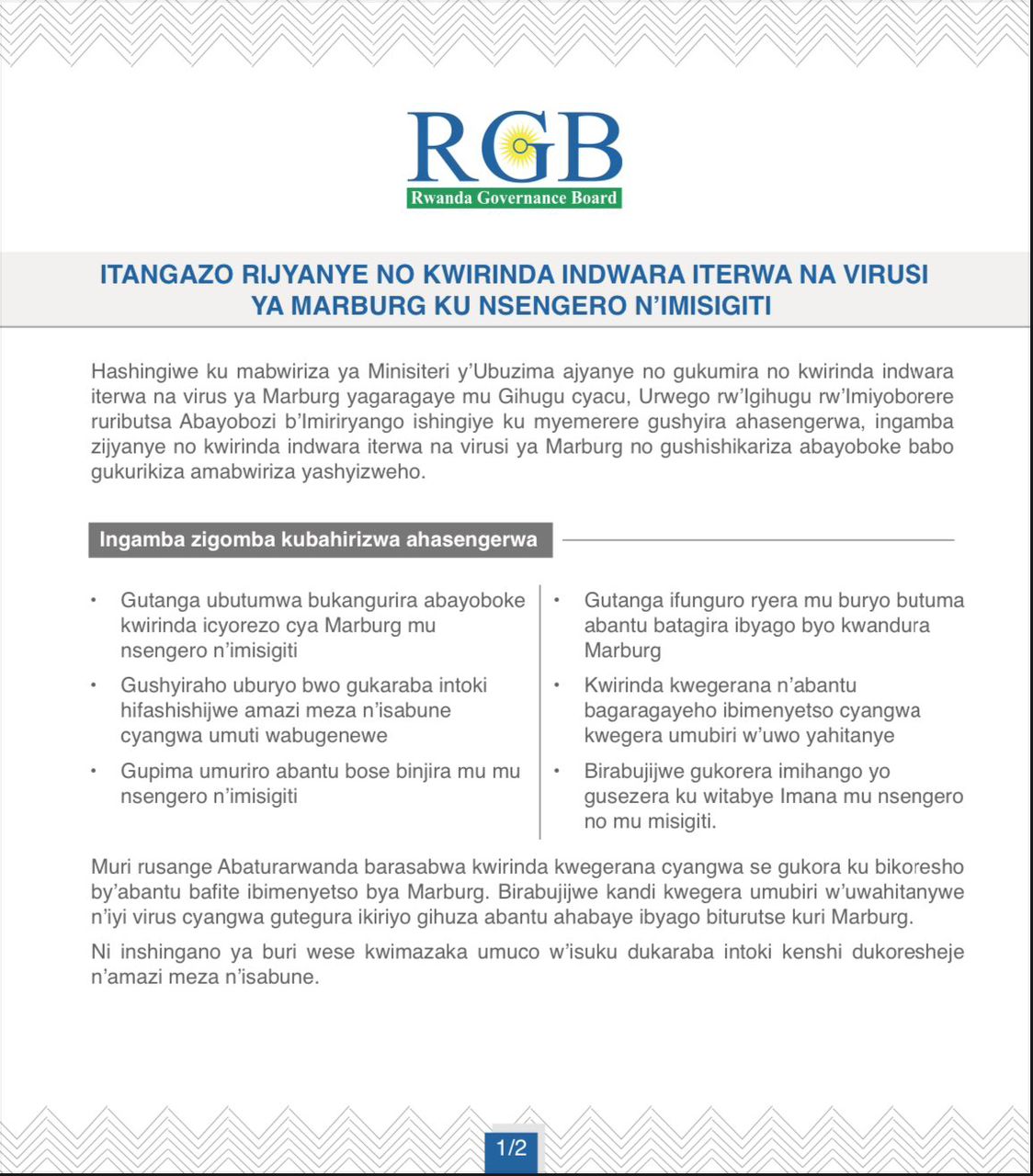 Urwego rw’Igihugu rw’Imiyoborere(RGB), rwashyizeho amabwiriza yo gukumira ikwirakwira ya virusi ya Marburg mu nsemgero no mu misigiti.