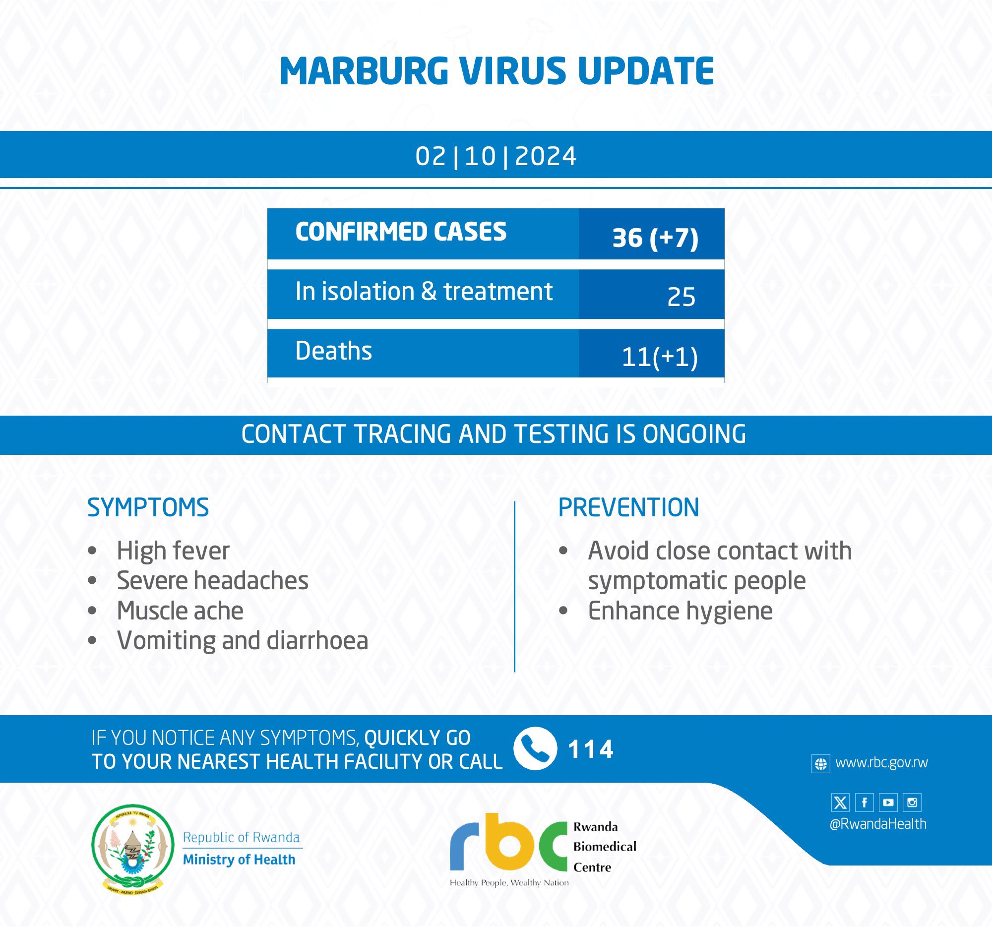 According to the figures from the ministry of health in Rwanda ( Minisante), as of Wednesday 02 October 2024, one person died from Marbug Virus Disease. 11 people have died so far from the disease.